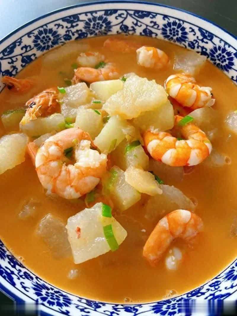 6. 加入虾仁:当冬瓜快熟时,加入焯水后的虾仁,轻轻翻动,让虾仁和冬瓜混合均匀。继续炖煮2-3分钟,直到虾仁熟透,汤汁略微收浓。