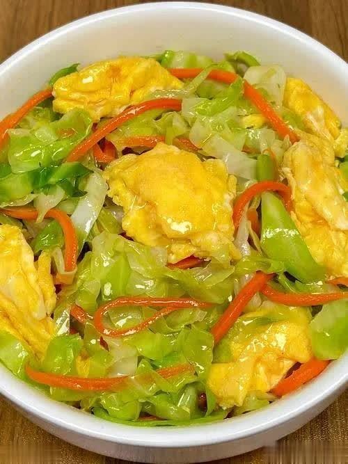 6. 加入炒蛋:当包菜略微断生且变软时,将之前炒好的鸡蛋倒入锅中。用铲子将鸡蛋和包菜充分混合,继续翻炒1-2分钟,直到鸡蛋与包菜均匀融合,味道完全渗透。