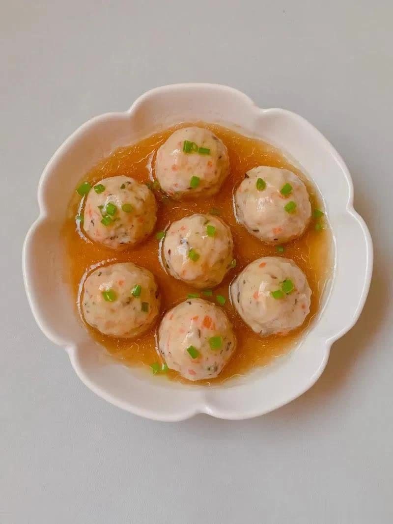 3、香菇肉丸蒸熟后,取出来撒上葱花点缀,即可端上桌开吃。