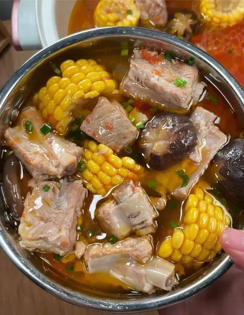 7. 出锅装盘:炖煮完成后,取出汤锅,捞出姜片和葱段,可以根据口味适量加入白胡椒粉、盐调味。最后将炖好的玉米排骨汤倒入汤碗中,红枣和枸杞增色增味,汤鲜美,排骨软烂,玉米甘甜。