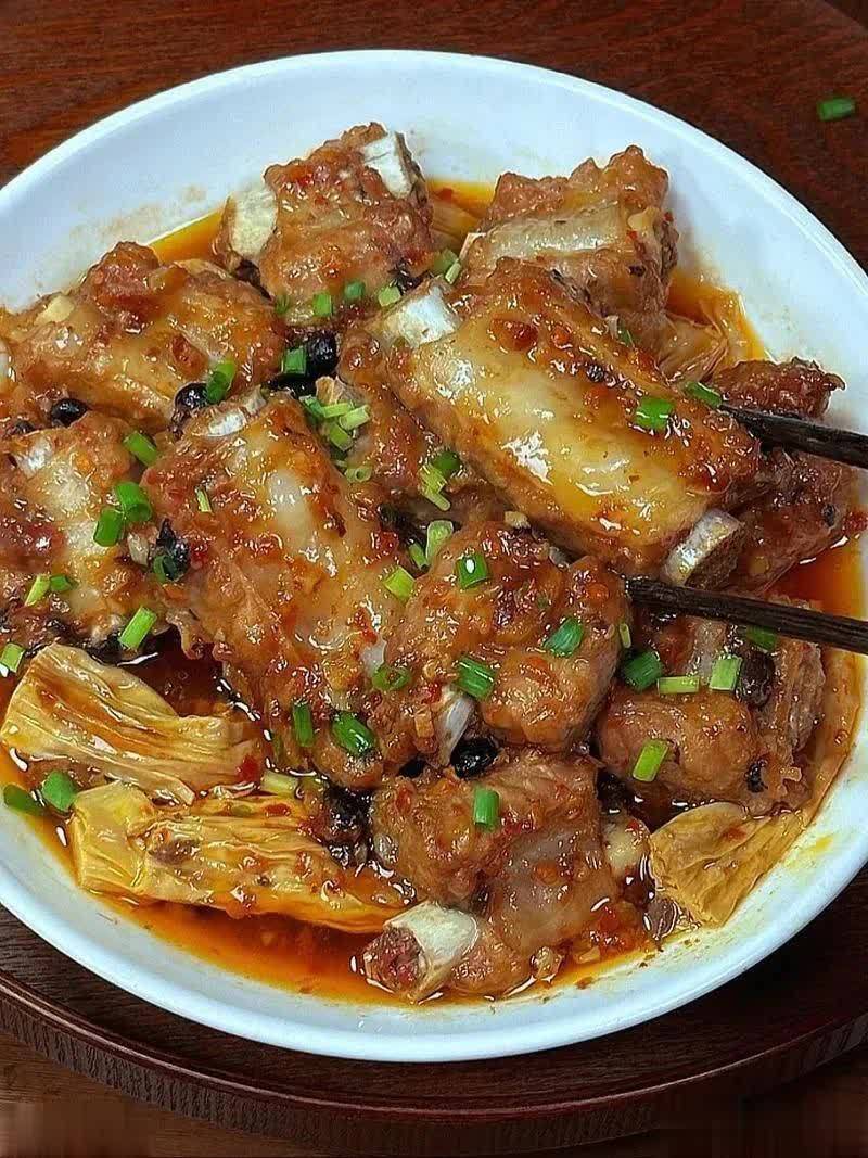 3、腐竹排骨蒸熟后,取出来撒上葱花点缀,即可端上桌开吃。